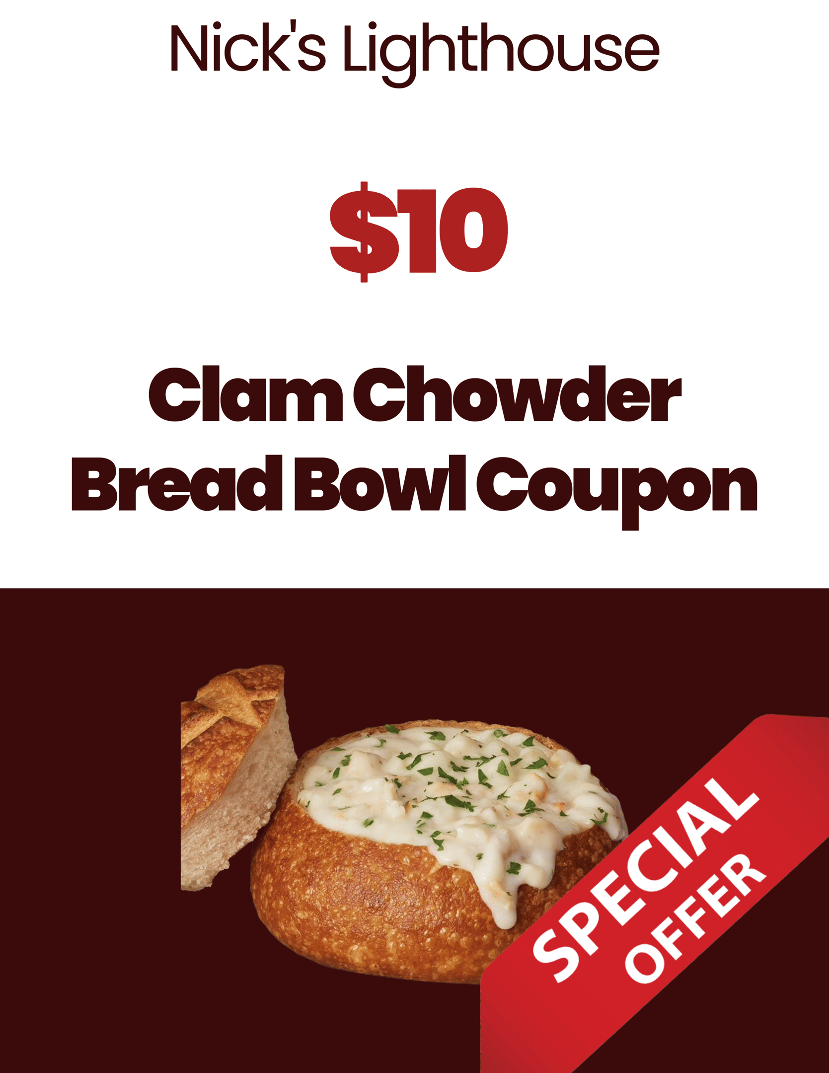 Show this coupon to receive a Clam Chowder Bread Bowl for $10! For in-store only.