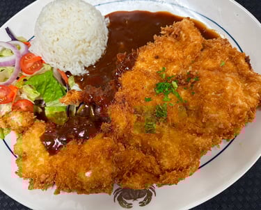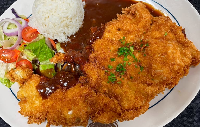 Crispy Pork or Chicken cutlet served with a sweet and savory sauce, rice, and salad.