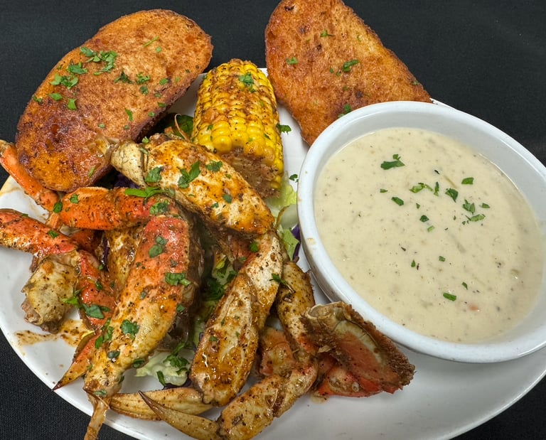 Half Dungeness crab tossed in a house Old Bay blend served with a bowl of clam chowder, garlic bread, and corn for only $29. For a limited time only!